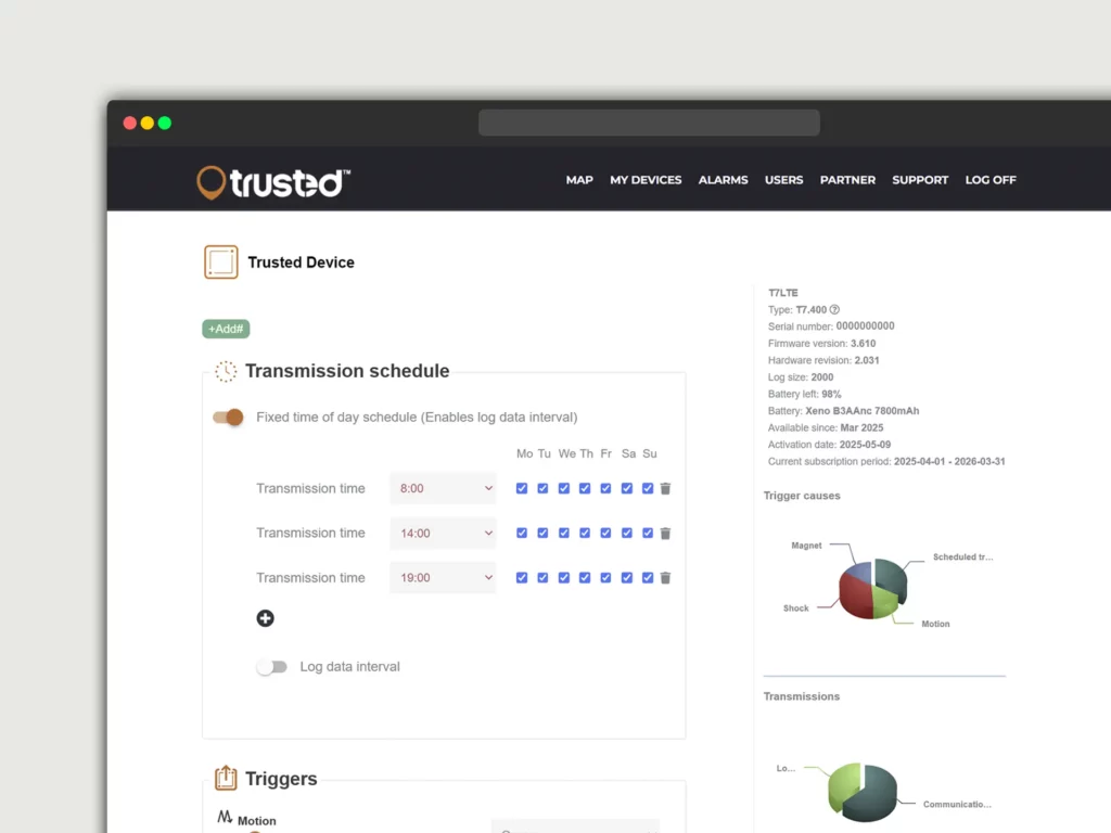 Set up sensor trigger thresholds, manage user access and edit transmission schedulesManage devices and users