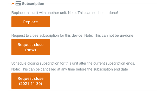 If you wish to close your subscription for the device after the current subscription ends, you can press Request close (date). This can be cancelled at any time before the subscription end date.